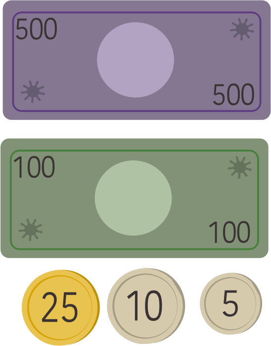 Want some play money? Here is an easy set. Mathmatics are easier with one unit, so didn't use a dollar/cents system, and just had whatever monetary unit is symbolized be the same on coins and bills, just the bills are bigger than the coins.