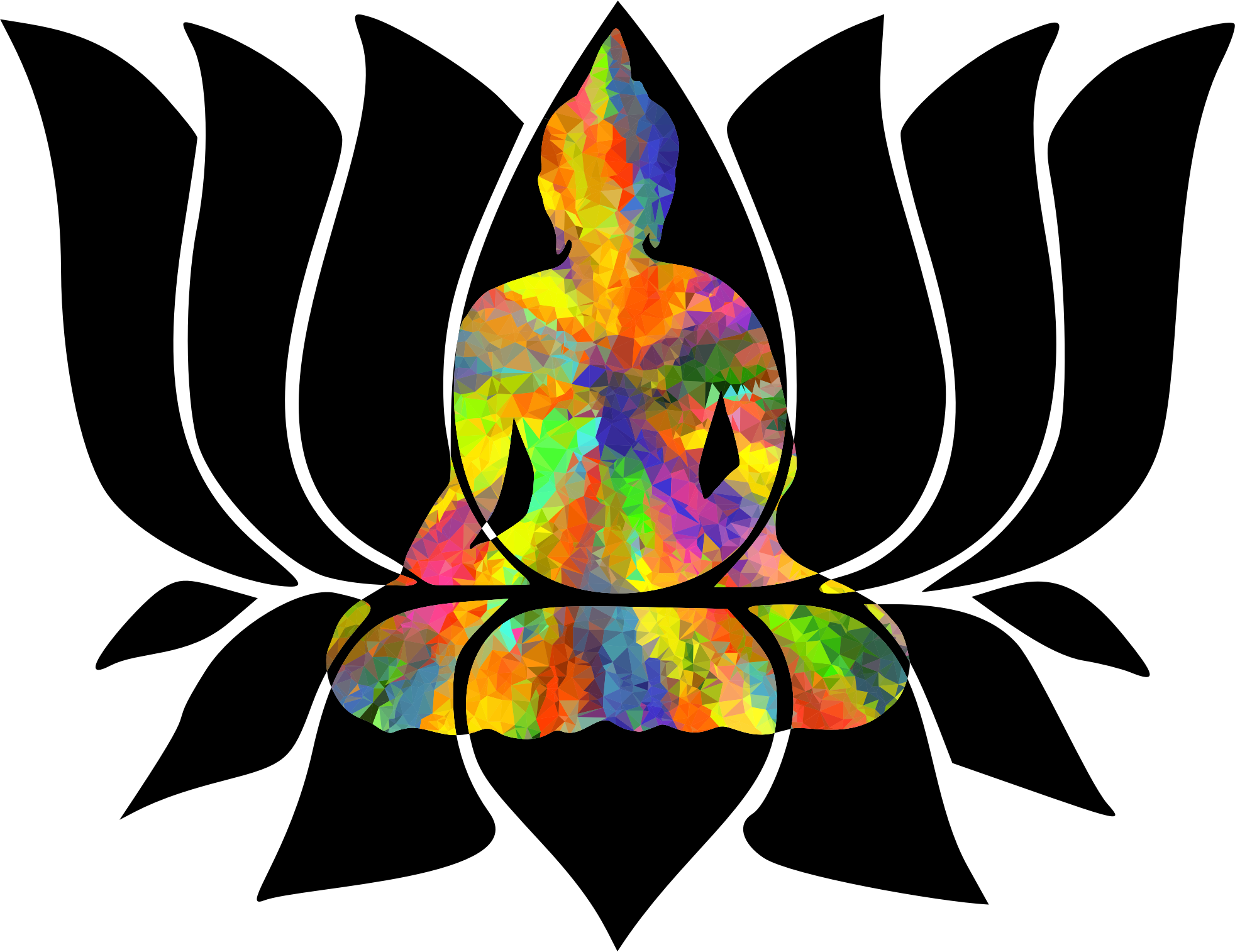 - remix+312159 remix+309349 Buddha Buddhist Buddhism Man Male Human People Person Religion Belief Spirituality Meditation Mindfulness Sitting Lotus Position Silhouette Lotus Zen Harmony Yoga Floral Flower Abstract Geometric Low Poly Polygons Triangles Art Negative Space Icon Colorful Prismatic Chromatic Rainbow