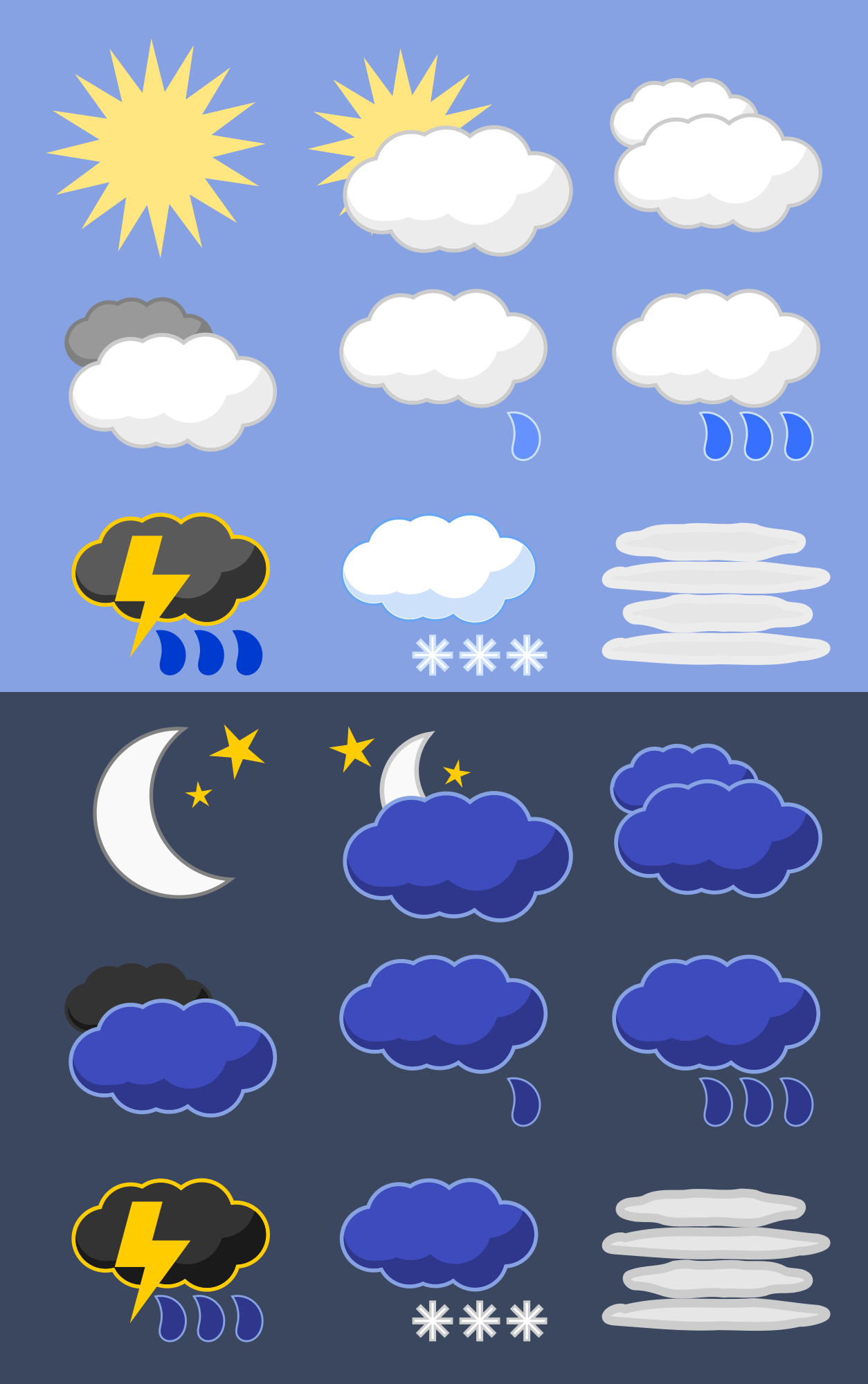 A set of weather icons for day and night in a semi-flat, cartoonish style.