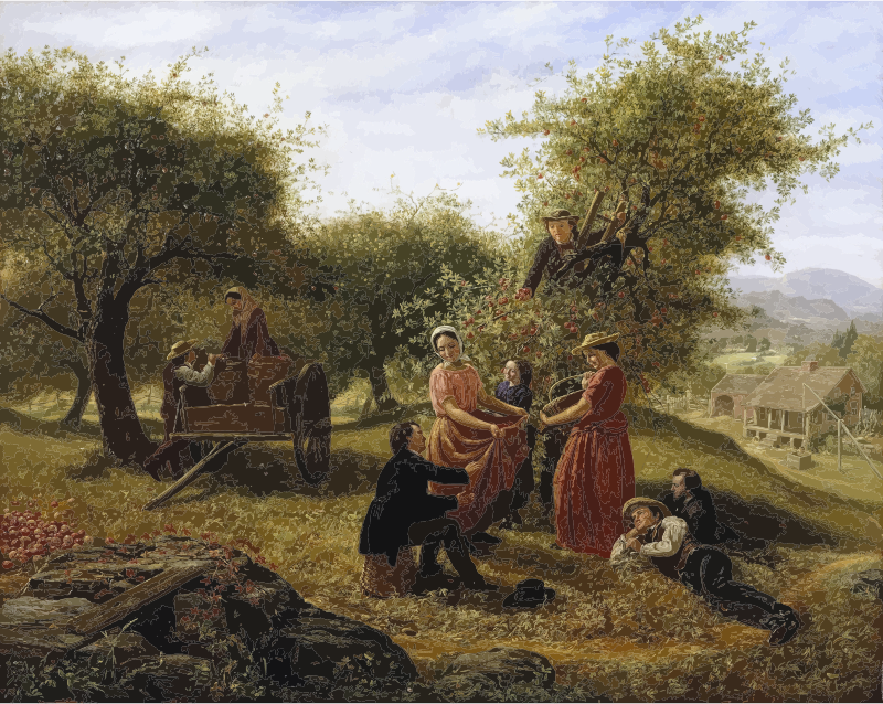 - Art Fruit Harvesting Jerome Thompson Landscape Orchard Painting Semi-Realistic People Source+Wikimedia Vintage