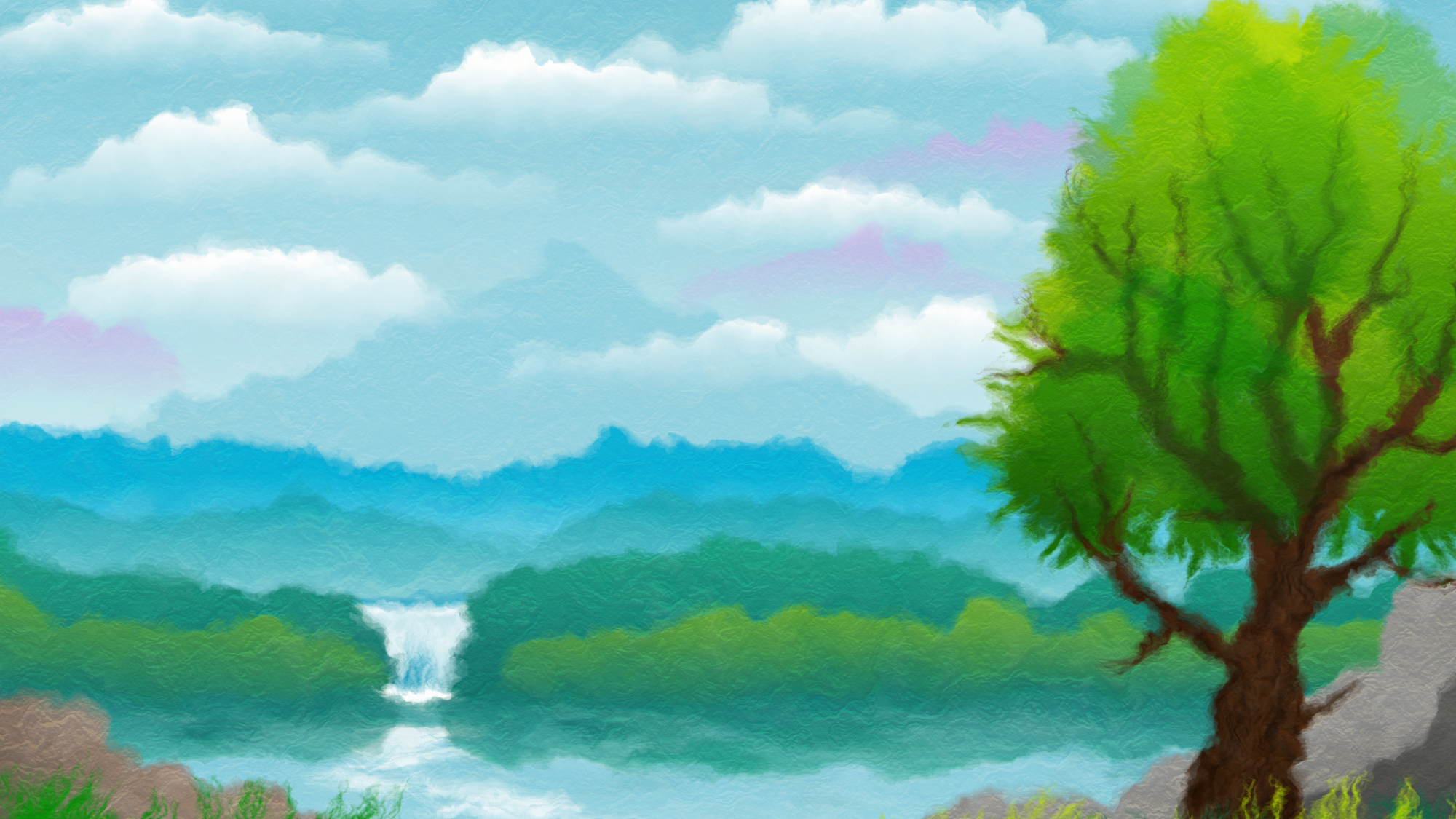 Landscape image with additional filters to add a painted appearance over a grainy paper. Current thumbnail image may look off as it is using an outdated rendering method. Try a current version of inkscape if you are in need of a rasterized version.