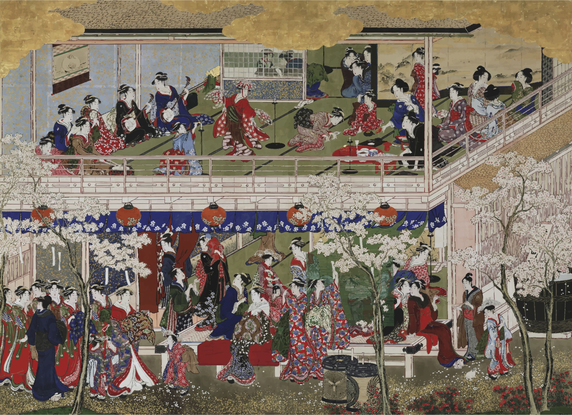- Cherry Blossom Sakura Yoshiwara Edo Kitagawa Utamaro Art Painting Landscape Japan Japanese Asian People Persons Humans Vintage Source+Wikimedia