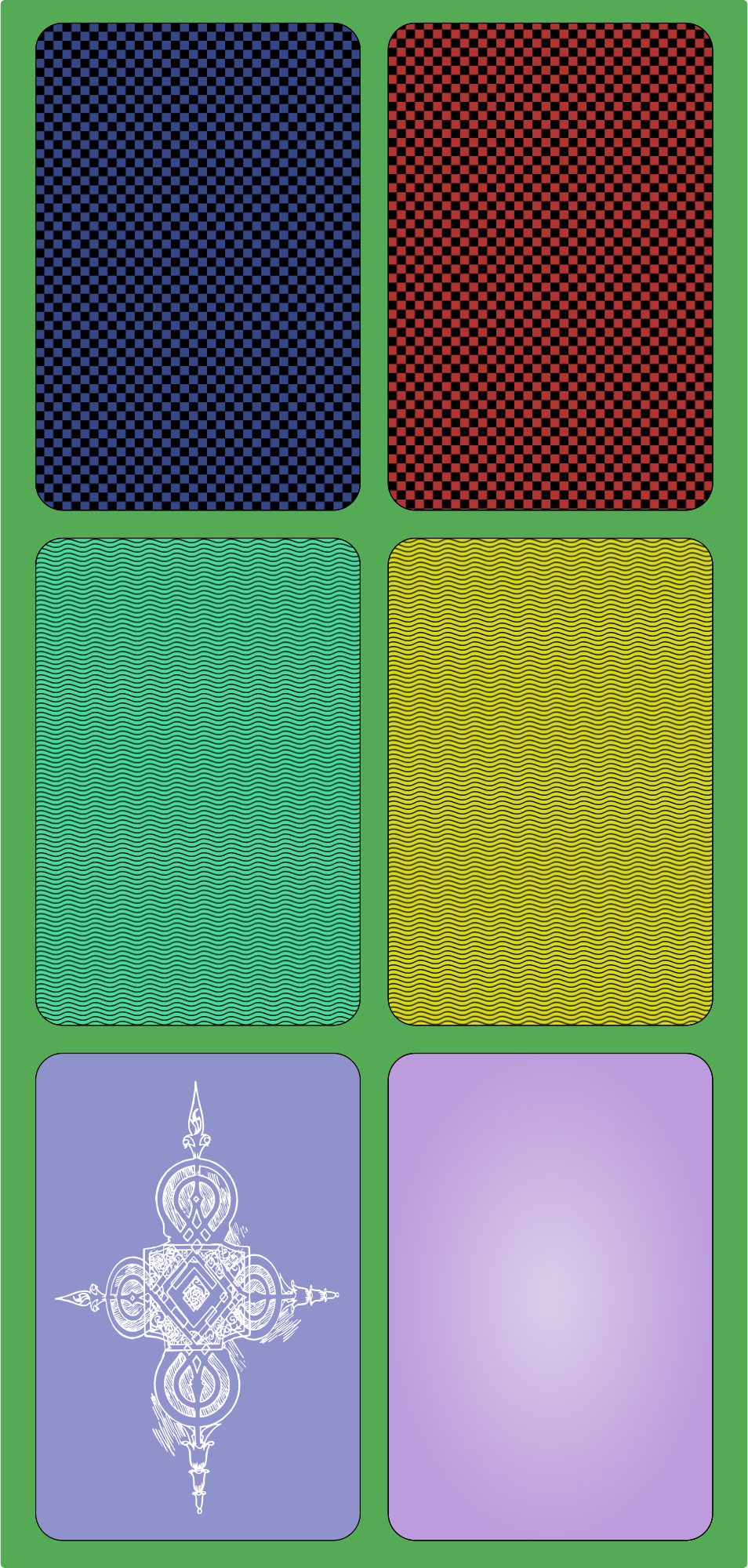 I thought, you can't have a deck of cards without having some nice options for the reverse of the cards. Here are 6 different back options for you to use with the original or any other similar playing cards that need a back side.