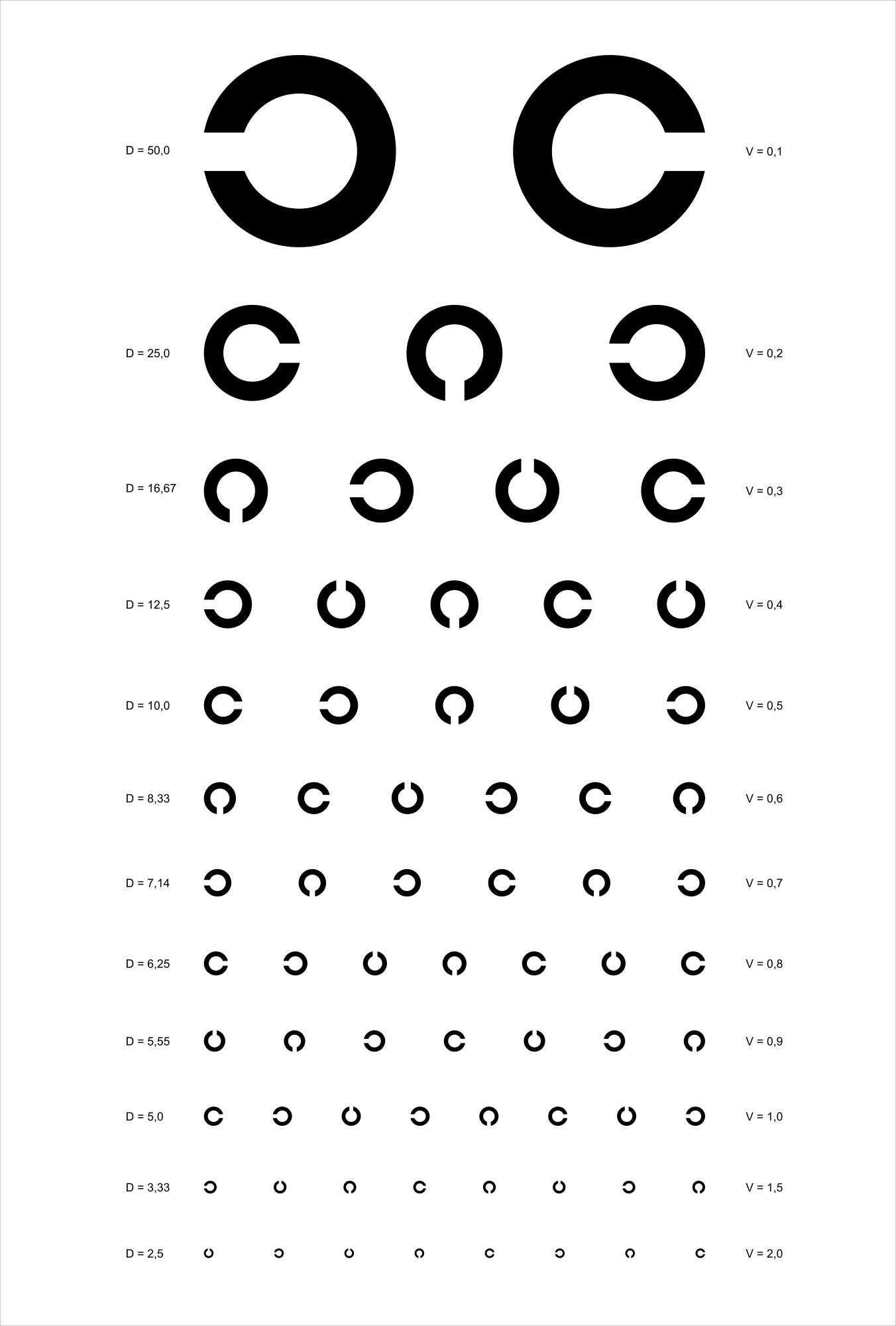 In Japan and Europe this type of vision test is quite common. Based on a public domain chart user UrSuS shared with Wikimedia.