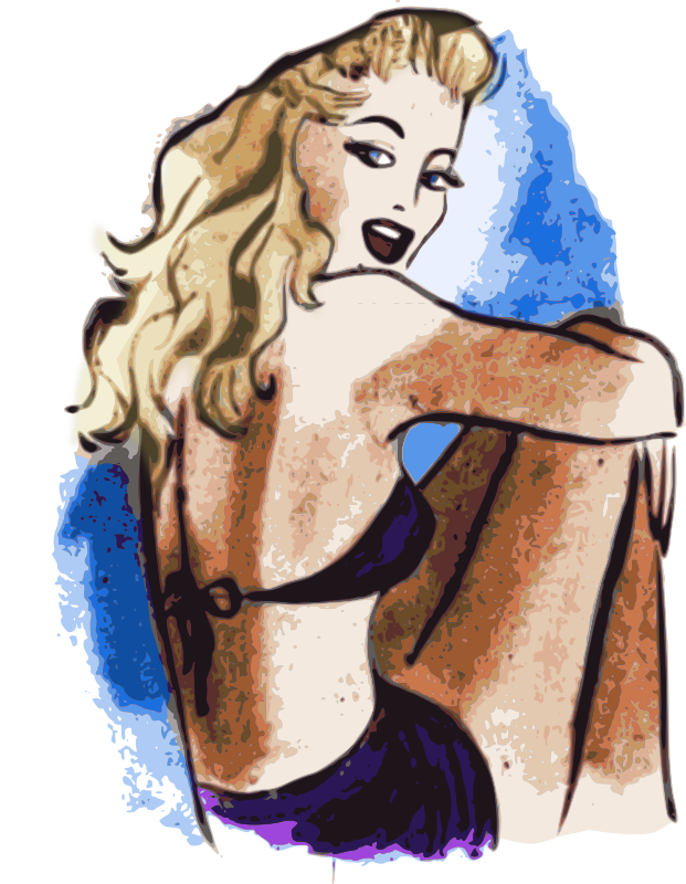 This is based (although highly motified while synthesizing) 1945 US Army depciction (and thus public domain) of a lady at the beach (typical "this is what you are fighting for" kind of propaganda stuff) .. The modern bikini hadn't been invented yet (was invented the next year) so this was actually just a two piece bathing suit.