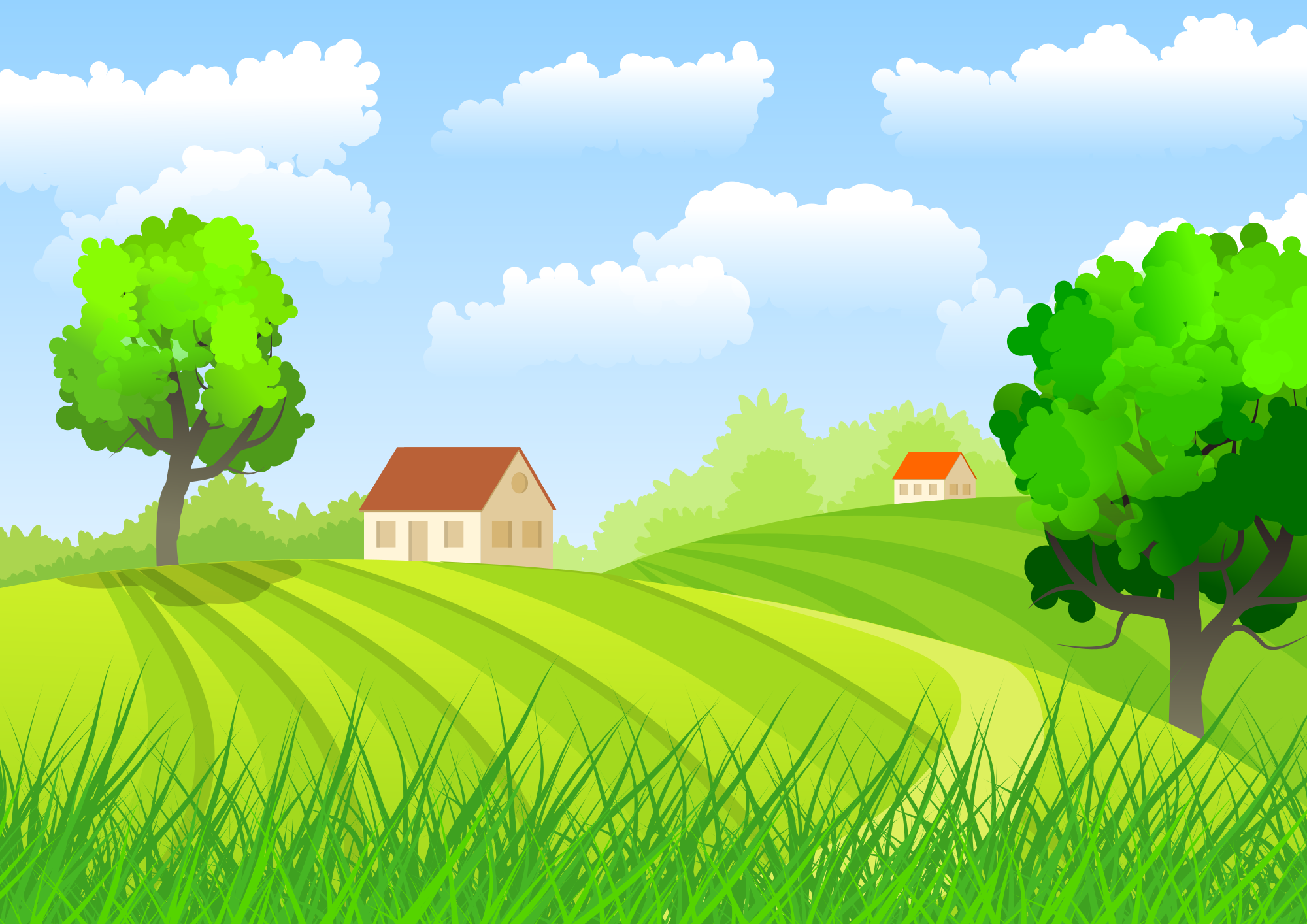 Natural landscape with fields, trees and small houses.