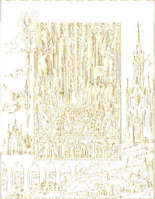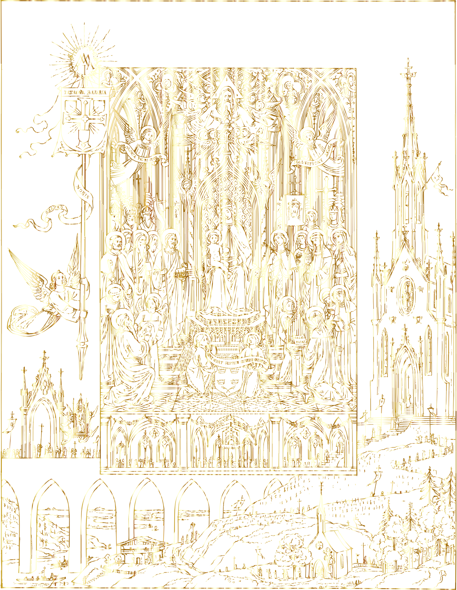 - remix+316484 Virgin Mary Mural Jesus Christ Divine Faith God Holy Messiah Prayer Catholic Christian Church Cross Crucifix Religion Spirituality Vintage Line Art Human People Person Angel Angels Saints Intricate Ornate Detailed Lithograph Gold Shiny Metallic