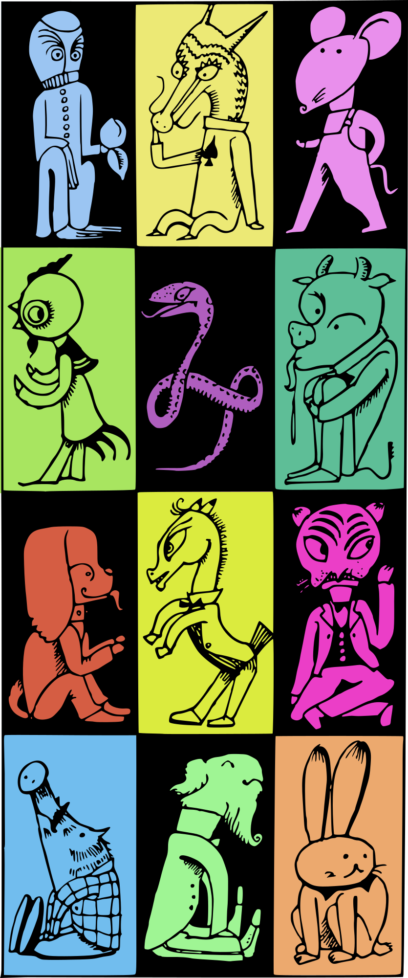 I thought I would make a colour (abstract colours not related to the actual animal colour of course) version of this grid of Chinese Zodiac animals.