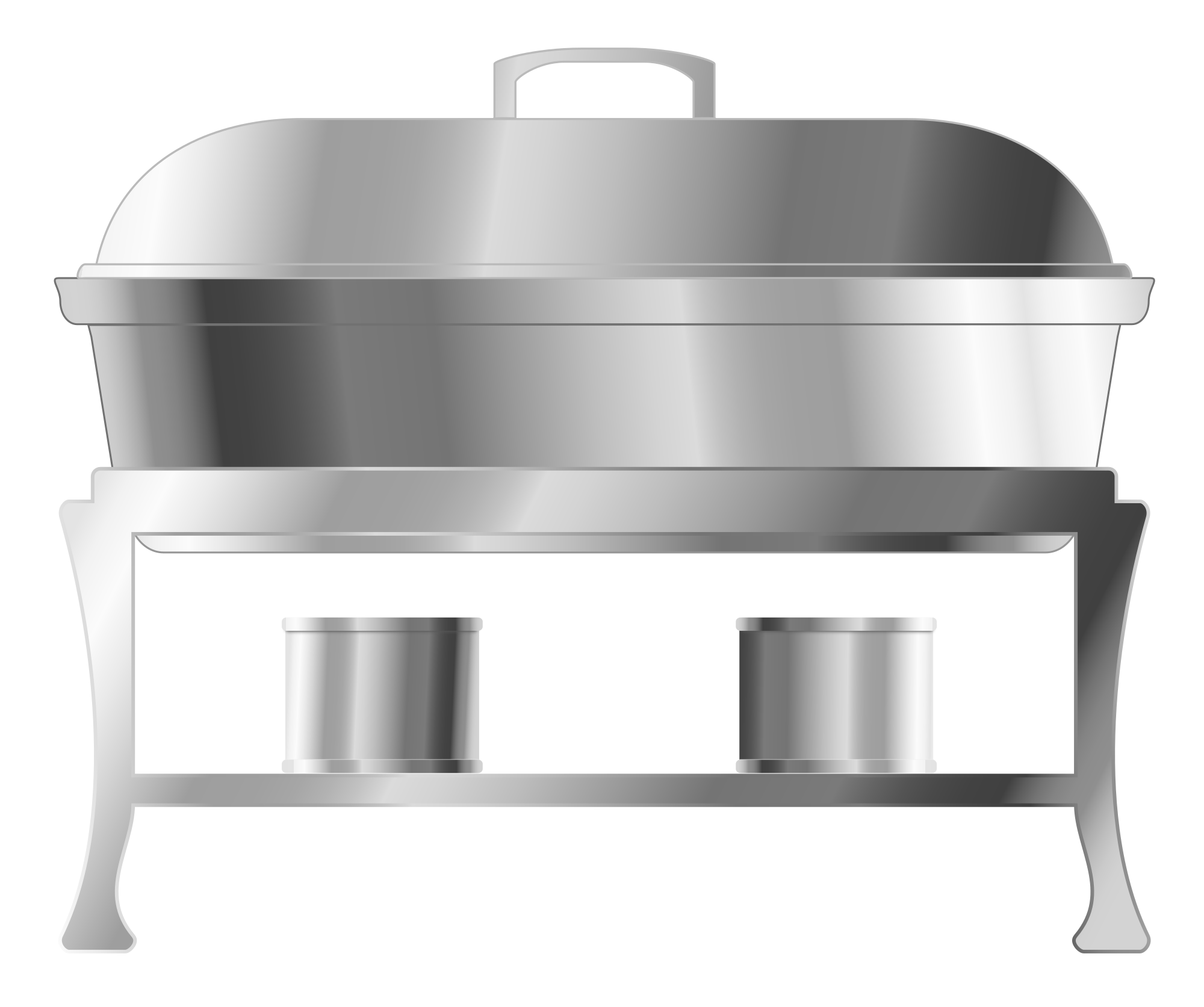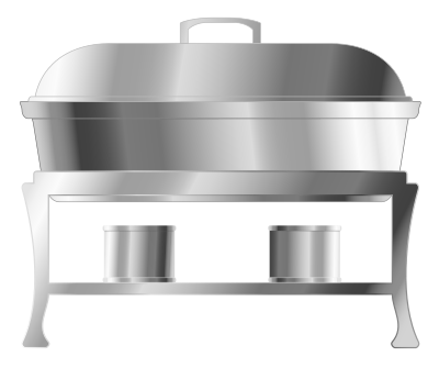 A lidded warming tray with cans of ethanol gel as a heat source.