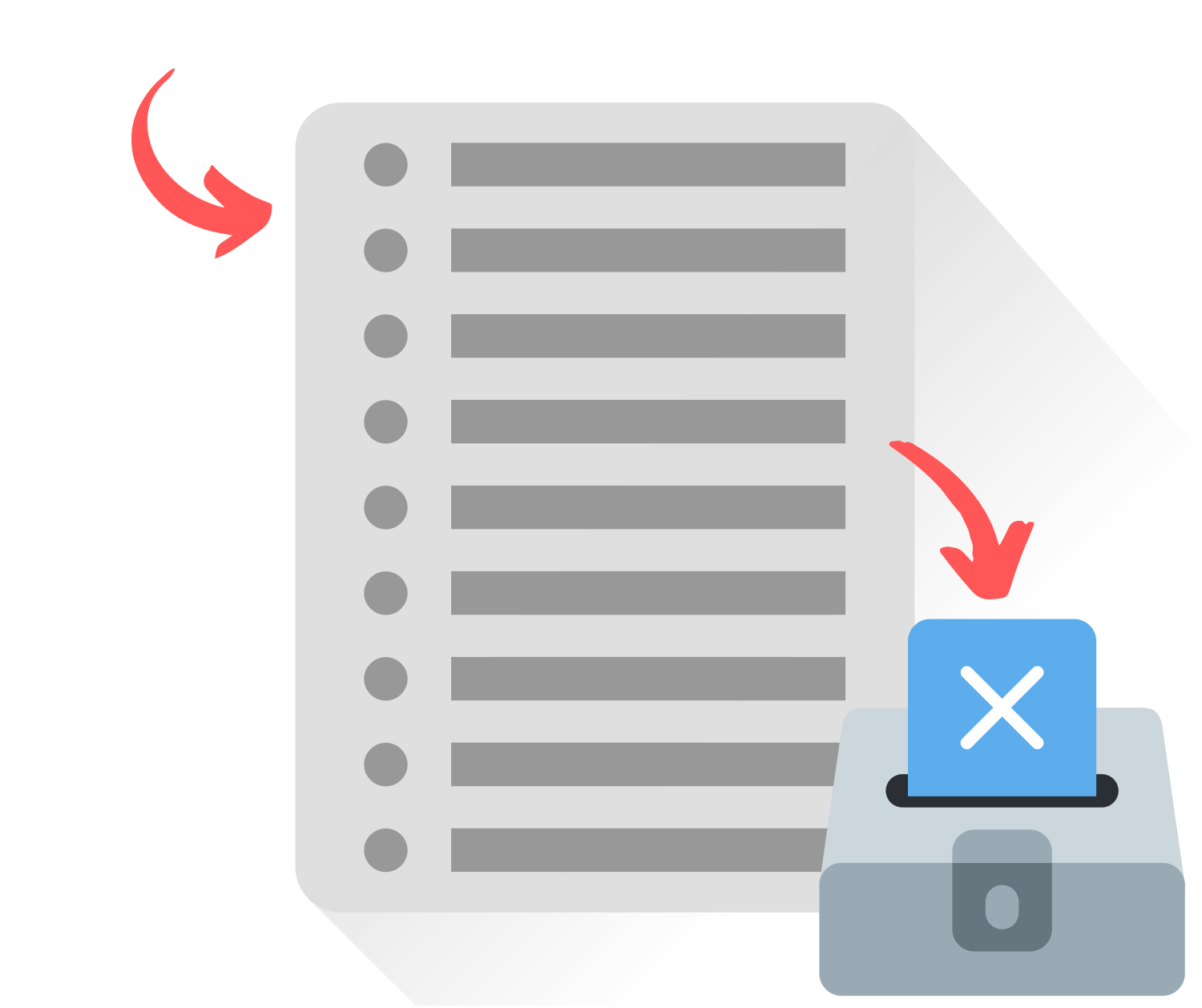 Voter Registration with a ballot box. Gray-scale with red arrows and a blue-ish ballot going into a ballot box.
