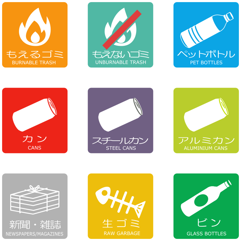 Various categories of rubbish that could be used to sort garbage in Japan... the stereotype of non-Japanese people in Japan is that they dont know how to sort garbage but of course anyone can be lazy about it ... so i hope this will help people who read Japanese and those who dont read Japanese with organizing their rubbish ... based on a public domain gahag image...
