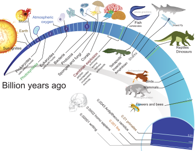 timeline of evolution of life on earth (based on a public domain image on wikimedia by LadyofHats)