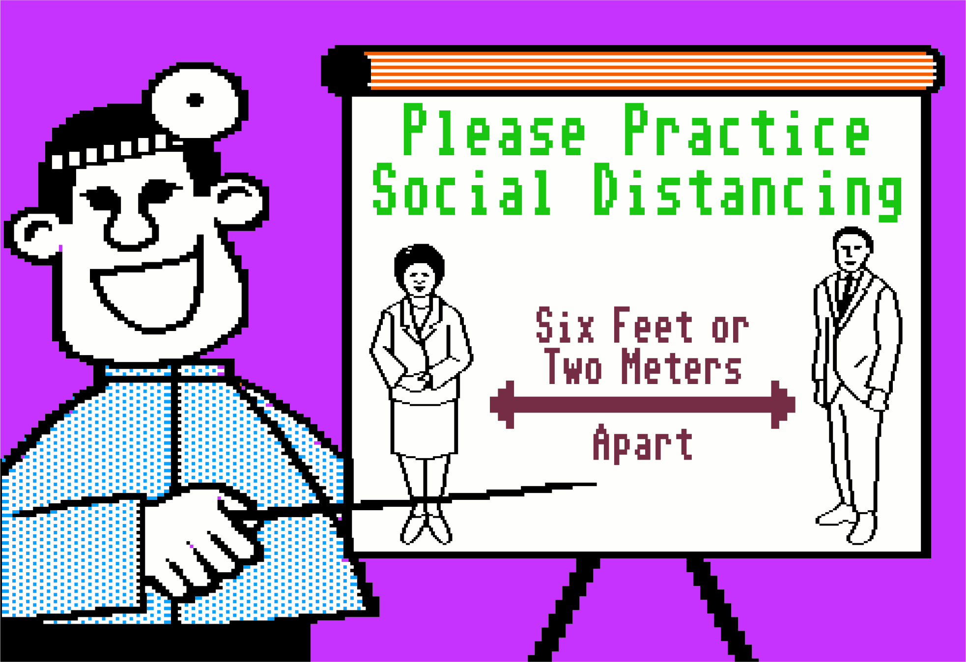 Social distancing sign in a retro 8-bit computer graphics bitmap/raster style.