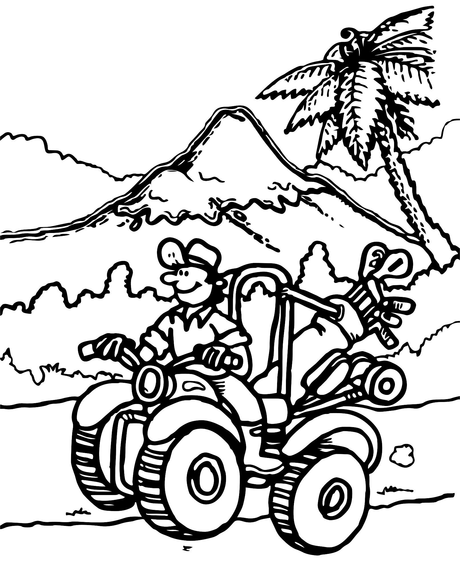 - golf farmer four wheeler muntaain New Zealand b-w cartoon off+road
