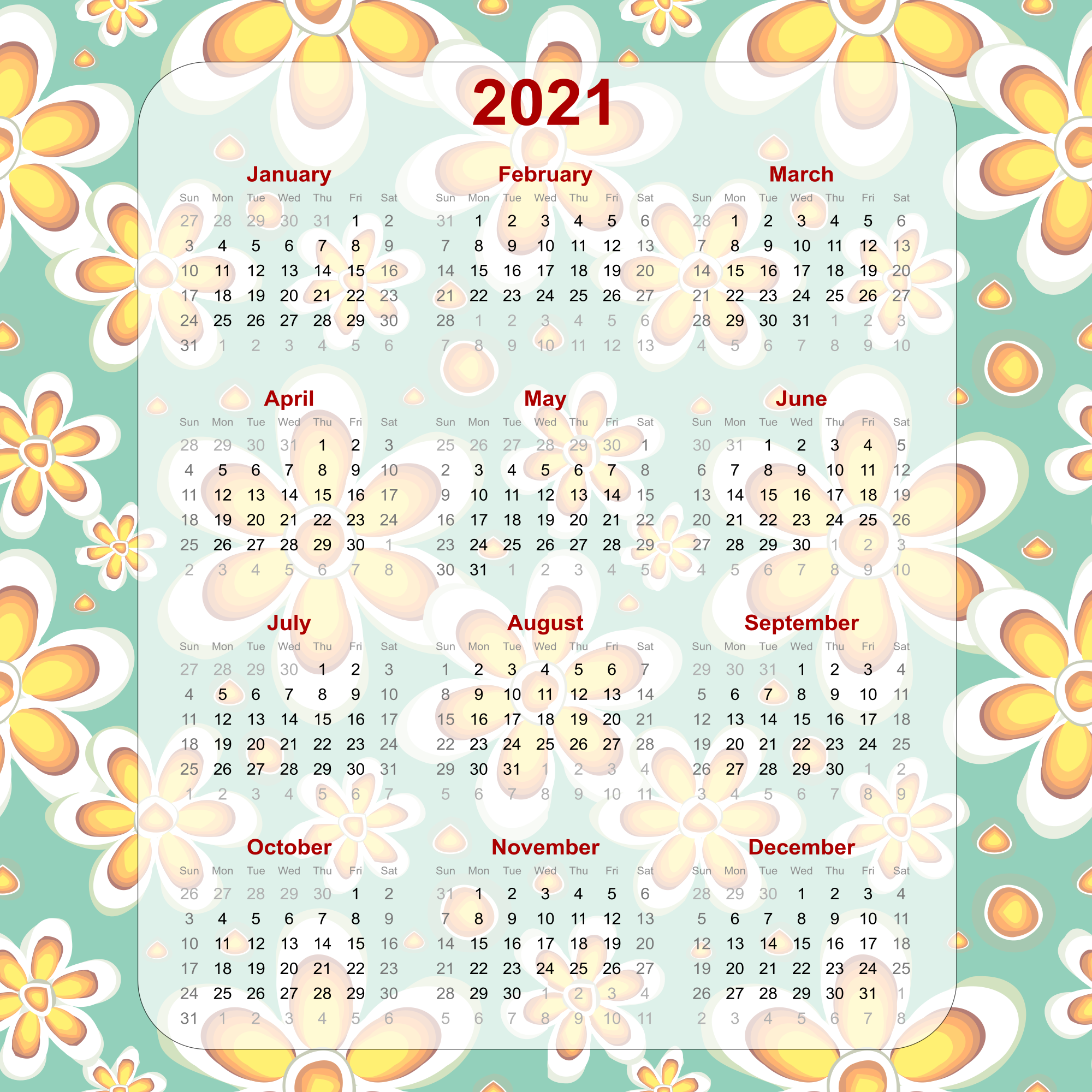 2021 calendar with a flower background, ready to print out and use