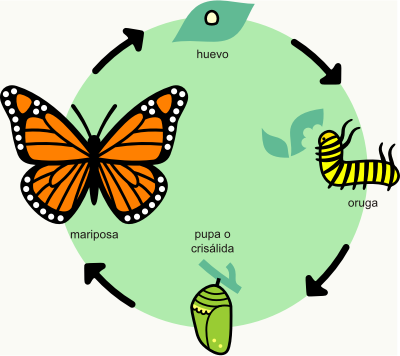 A simple depiction of the life cycle of a butterfly, with captions in Spanish. The butterfly is the Southern Monarch (Danaus erippus).This is part of a series of illustrations I did quite a while ago for my website about butterfly rearing. (Since they can be freely downloaded and used from there, why not upload them here? They're in the Public Domain anyway).