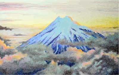 A painting of the Summit of Mt Taranaki at sunset