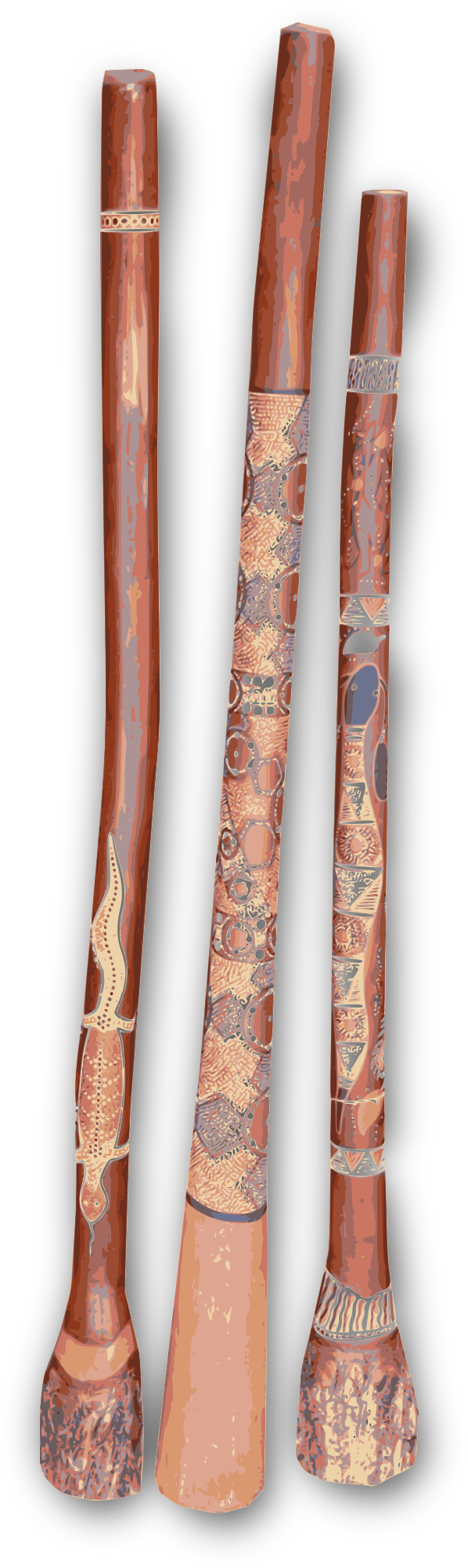 Three simple decorative didgeridoos in a row with shadows, based on a public domain photo by annedavid2012.
