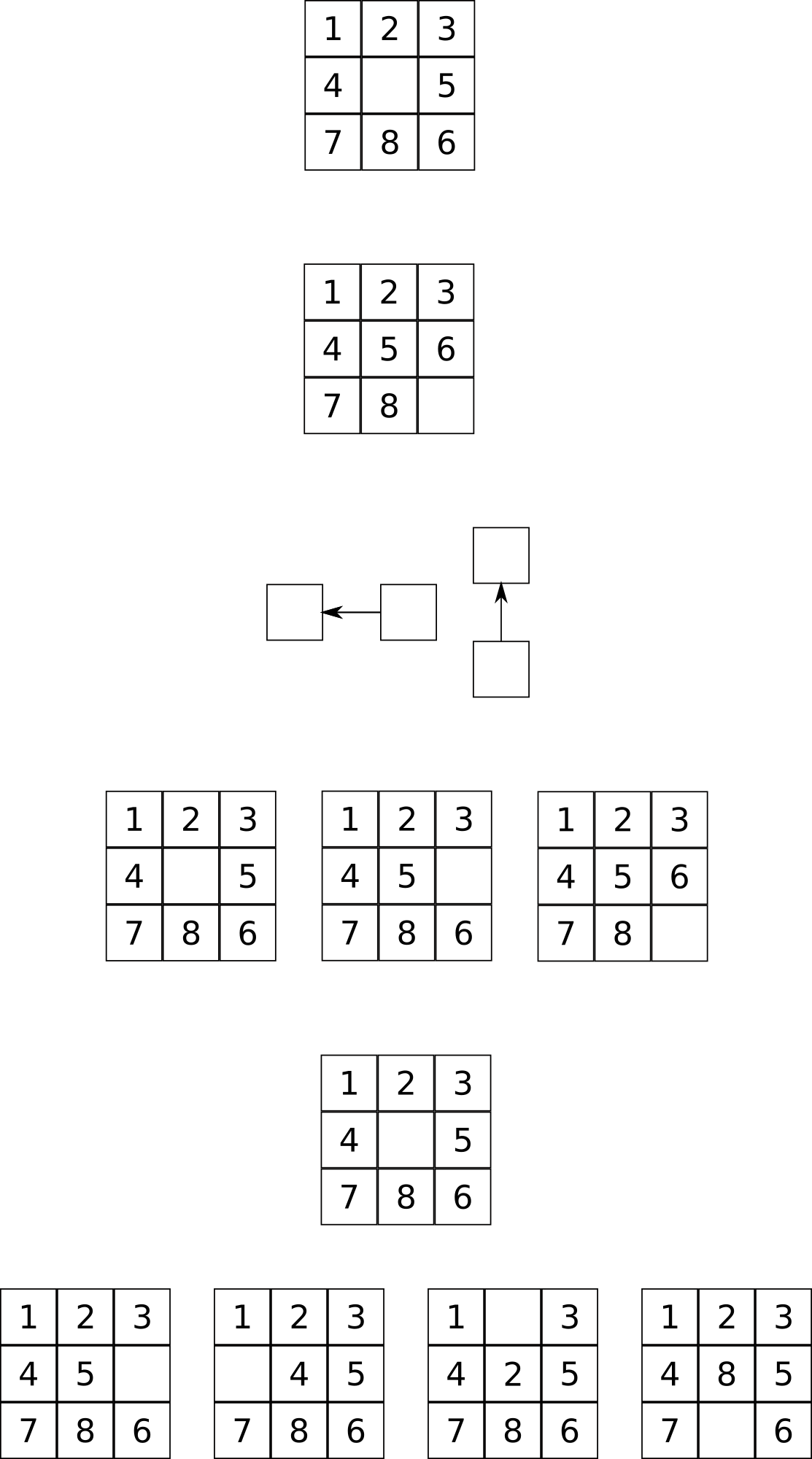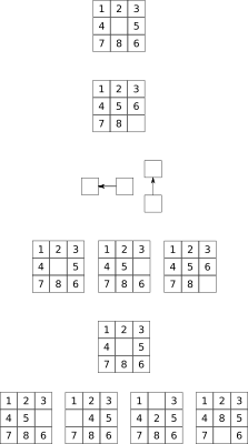 A 3x3 grid for a 8 pieces sliding puzzle. Note that this was created to show how to solve it using a search algorithm (breadth first search or depth first search or anything based on either one). This problem can be solved even in big instancies in a reasonable time using the a-star algorithm.
