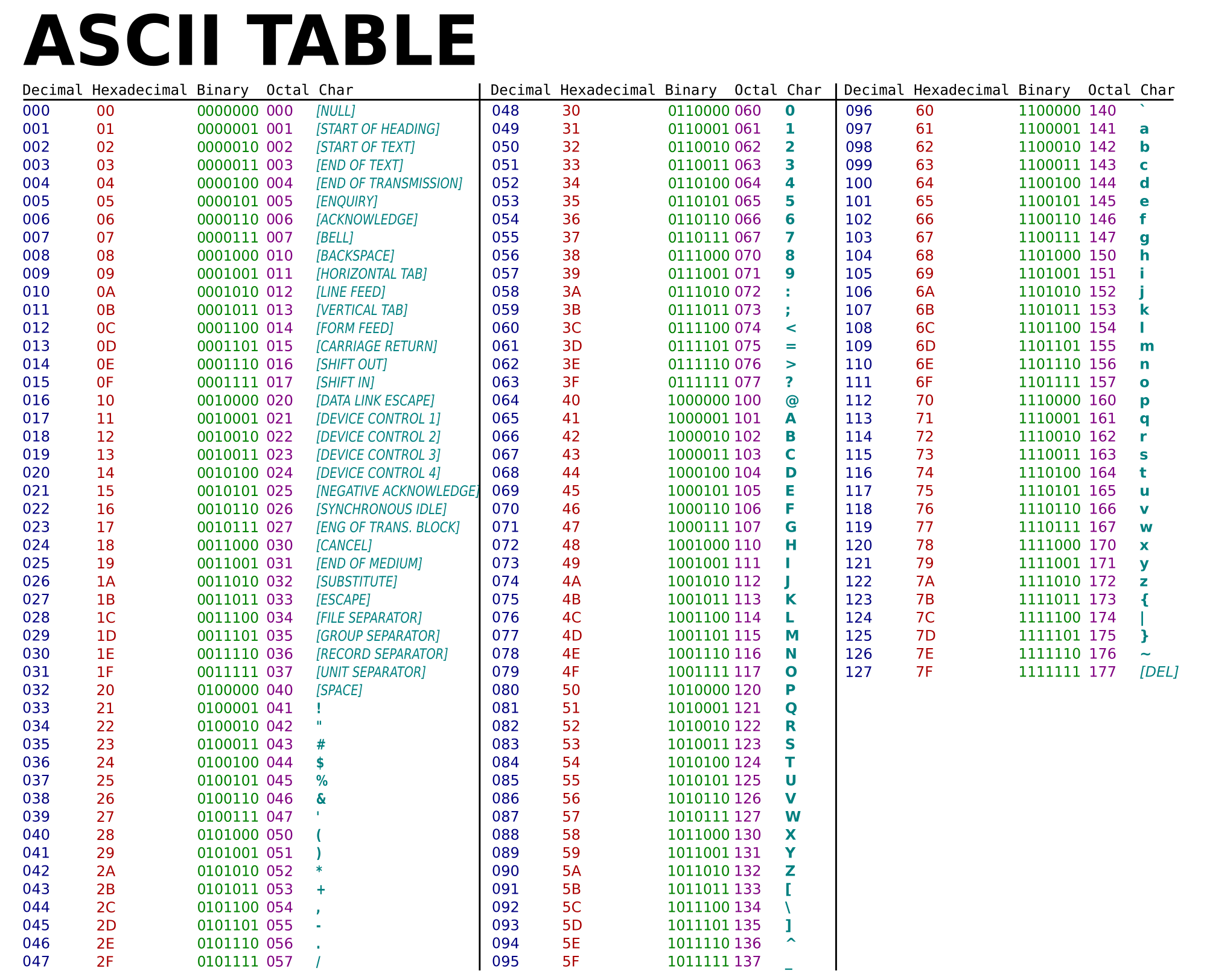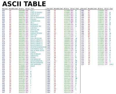 Ascii table based on public domain work: https://commons.wikimedia.org/wiki/File:ASCII-Table.svg .