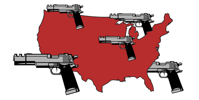 a map of America with guns on it to represent gun rights and large amounts of weapons apparently being bought right now in America and that whole thing...