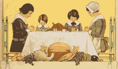 a rough vintage 1913 picture of a family praying/having a moment of silence before having a Thanksgiving dinner