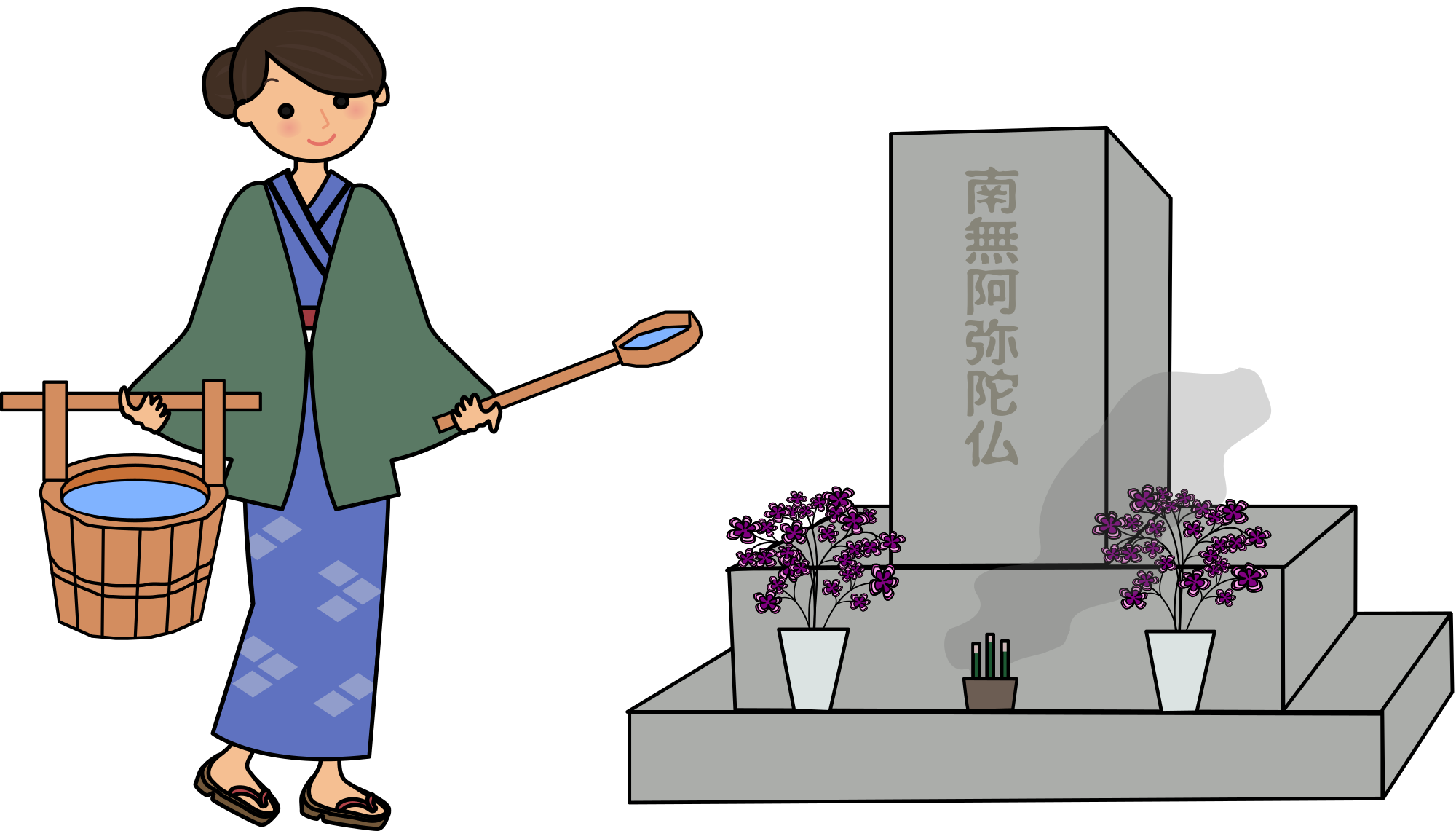 During the "Obon holidays" here in Japan, one of the things that people do is go wash the family grave. It's a ritual, with a bucket and a scoop to pour water over it. I thought there should be someway to symbolize this for everyone, so I spent way too long drawing this clipart for anyone who would want to use this on openclipart.org or whatever. I'm not sure how much use this will be to anyone, but providing it anyway.