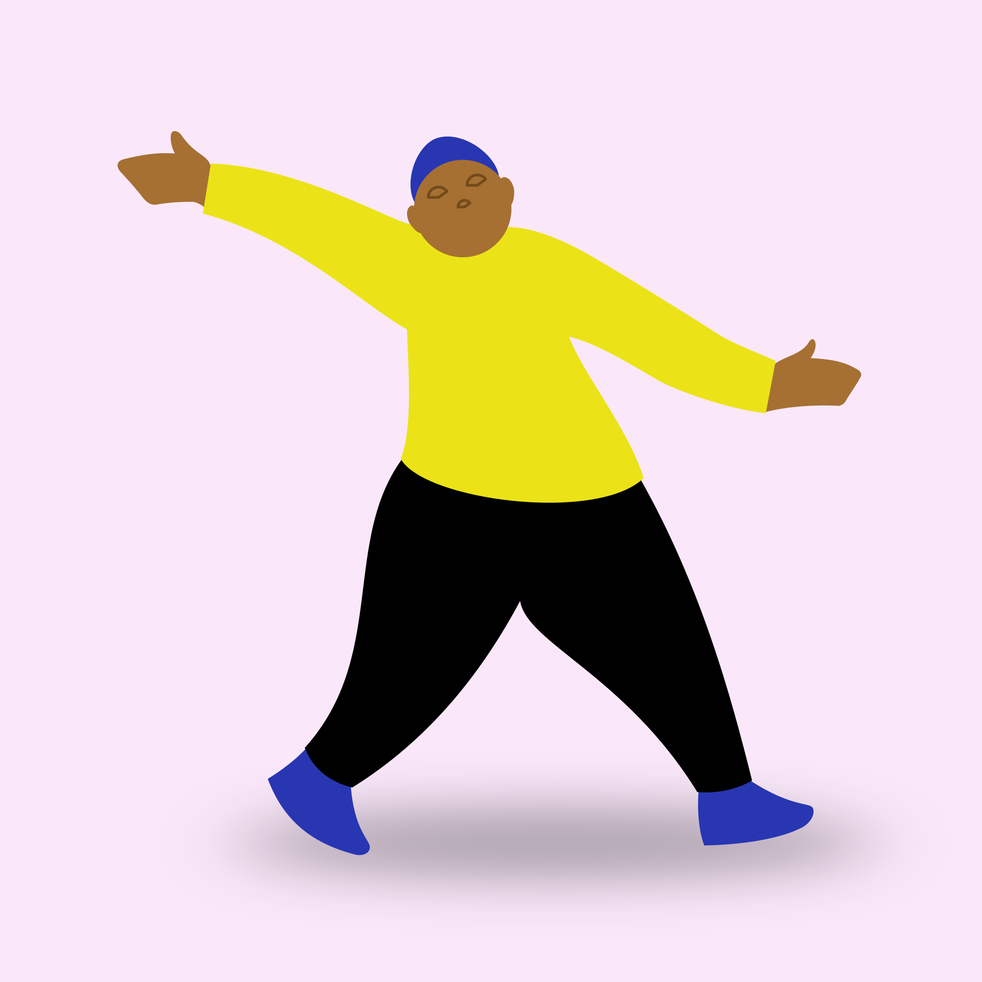 A boy wearing a blue cap, yellow shirt, and black trousers, with his arms up in the air.