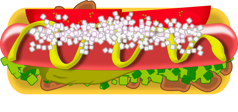 hot dog sandwich with onions, mustard, tomatoes, relish, chili, and pepper