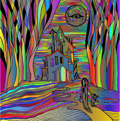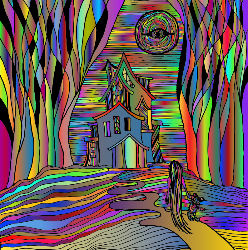 - Haunted House Halloween Scary Line Art Spooky Evil Girl Horror Colorful Prismatic Chromatic Rainbow Surreal Psychedelic