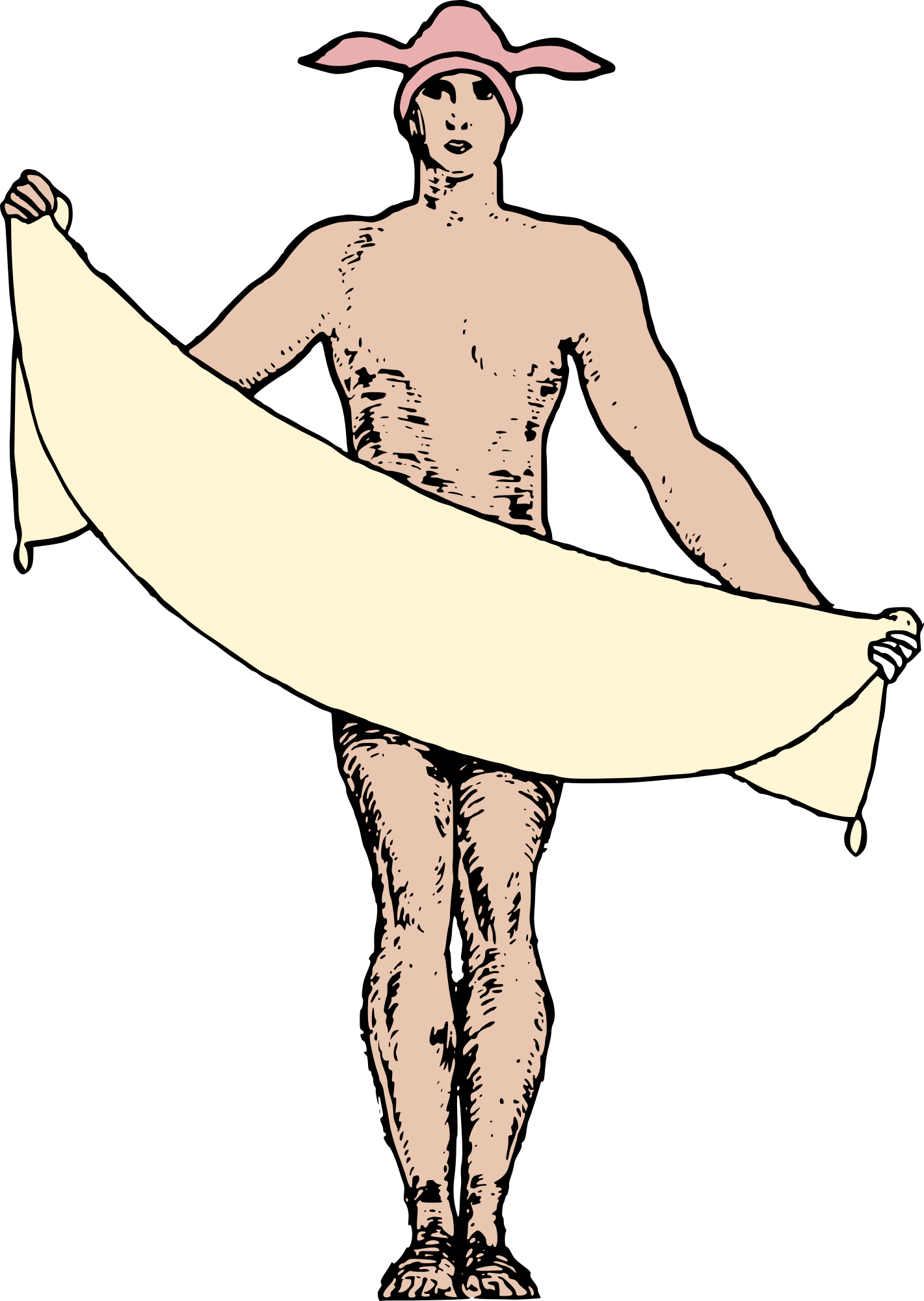 A naked man with a banner in a rabbit hat.