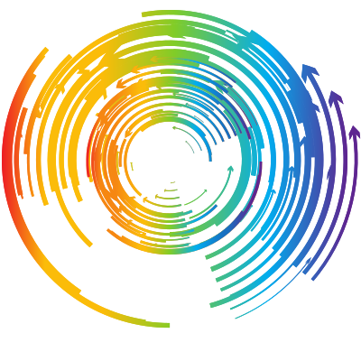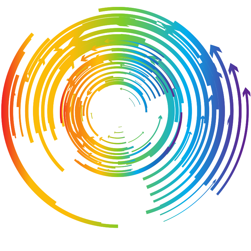Multi coloured concentric circles with arrows.