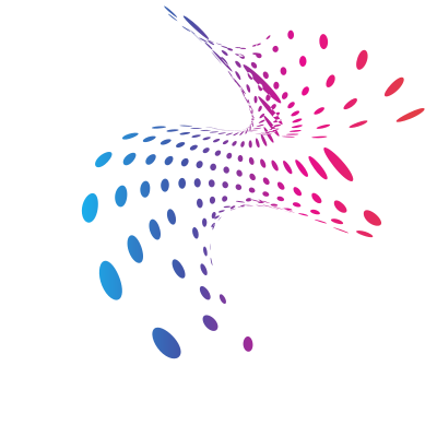 Abstract halftone shape with blue and red dots.