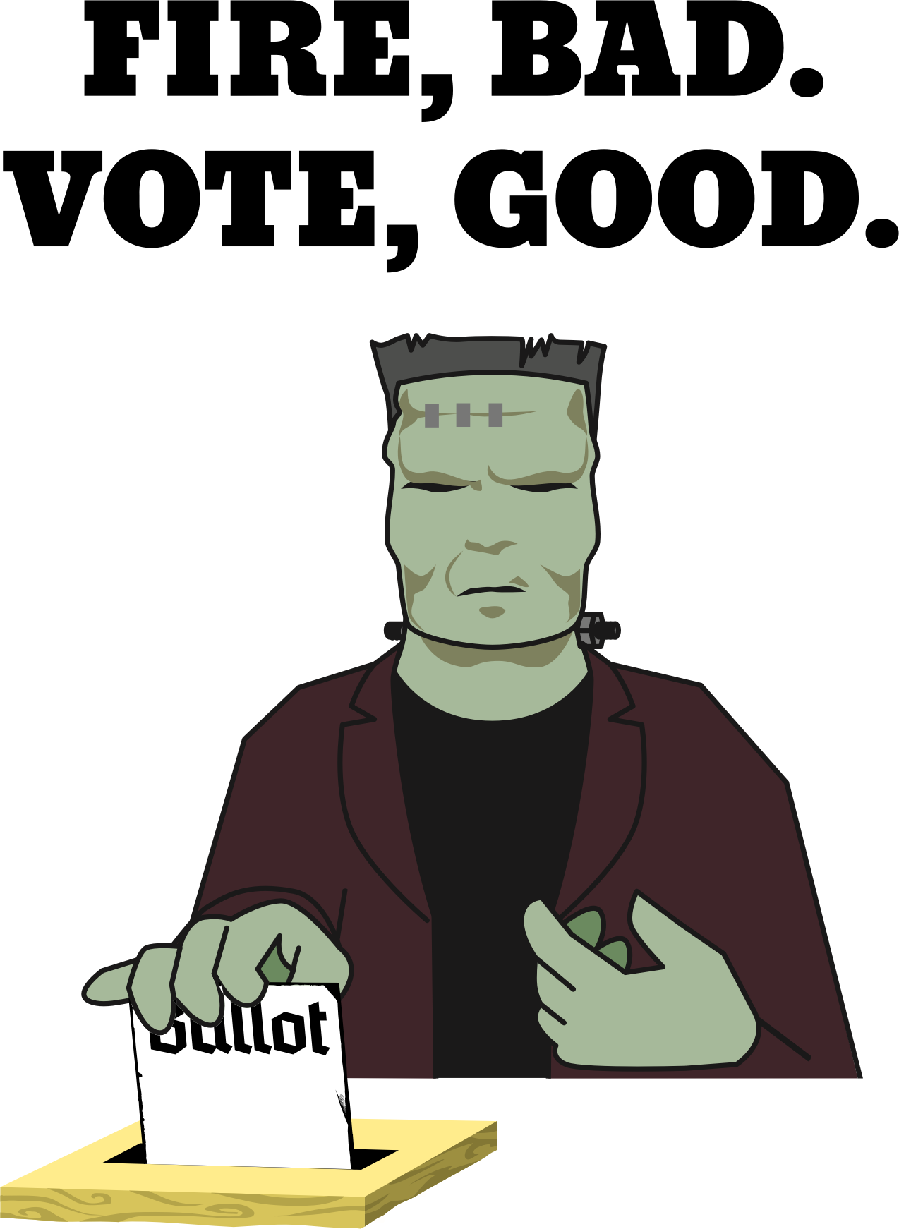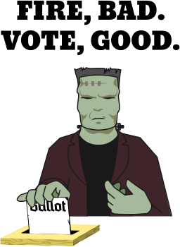 Frankenstein's Monster, betrayed by its creator and knowing what it's like to be a monster in the eyes of society, is acutely conscious of the need for equality under the law and accountable representation in government. A poster of Frankenstein's Monster casting a ballot into a ballot box below the words "Fire, bad. Vote, good."