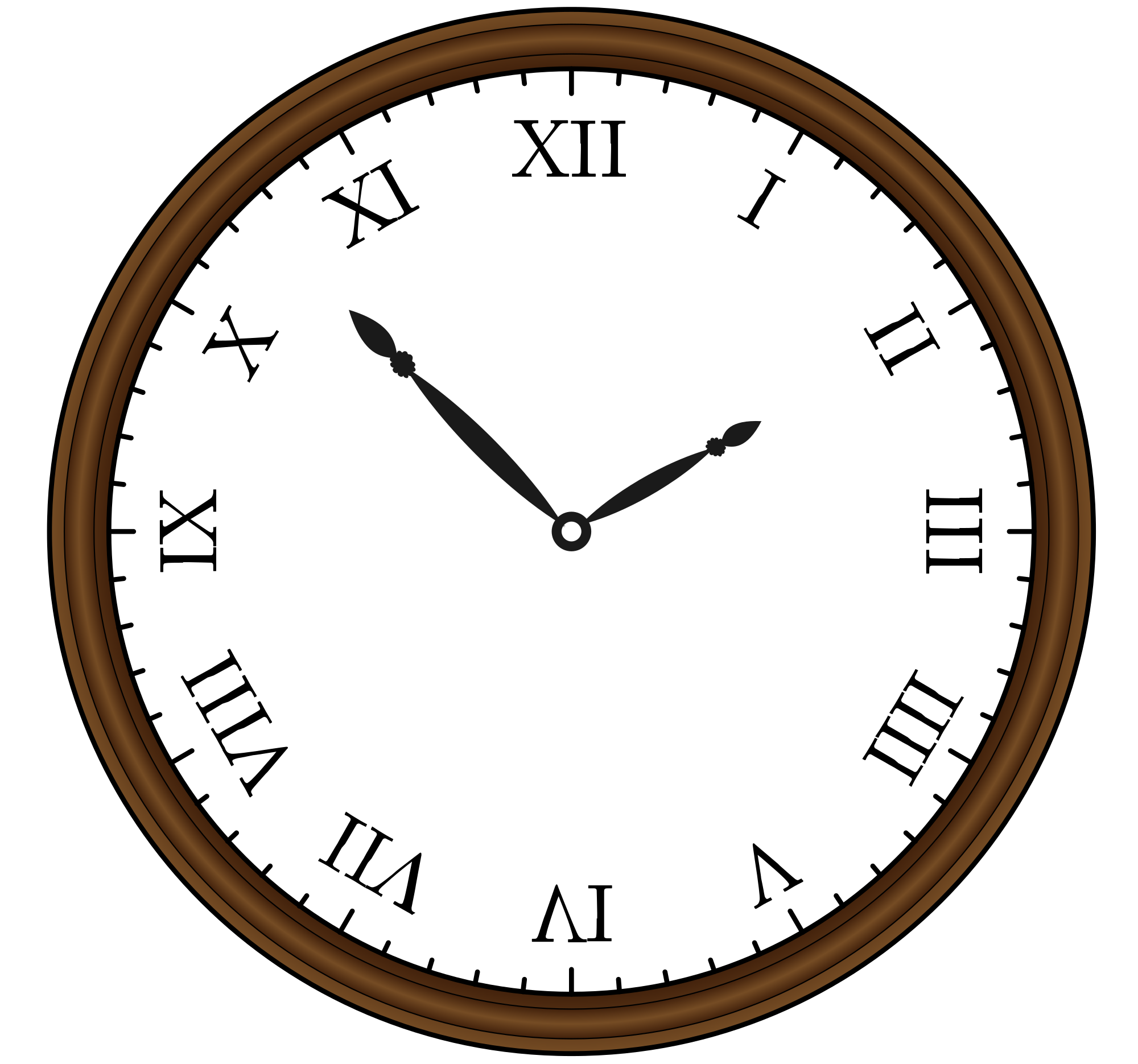 This is my second try at this clock. The original "A Retro Clock" was by @Fred the Oyster in 2015. In my previous remix of this image I had fixed some numerals that had not had the right numbers. This time I am taking that remixed image and using a different convention for the arrangement of the roman numerals. In this arrangement the numerals are arranged around a circle such that the numerals are arranged as if they are being viewed from the center of the clock. Thus the roman numeral for 6 (VI) is upside down from the perspective of the person viewing the clock face from the front. Also the roman numeral 4 (IV) is replaced by the other roman numeral for 4 (IIII) which is very common, especially on older clocks. Here is a Web page about roman numeral variants as well as a photograph of a clock face with roman numerals of the same sort as I'm putting on this clock.
