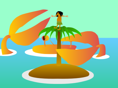 Animation of a big crab attacking a person on a palm tree with scissors