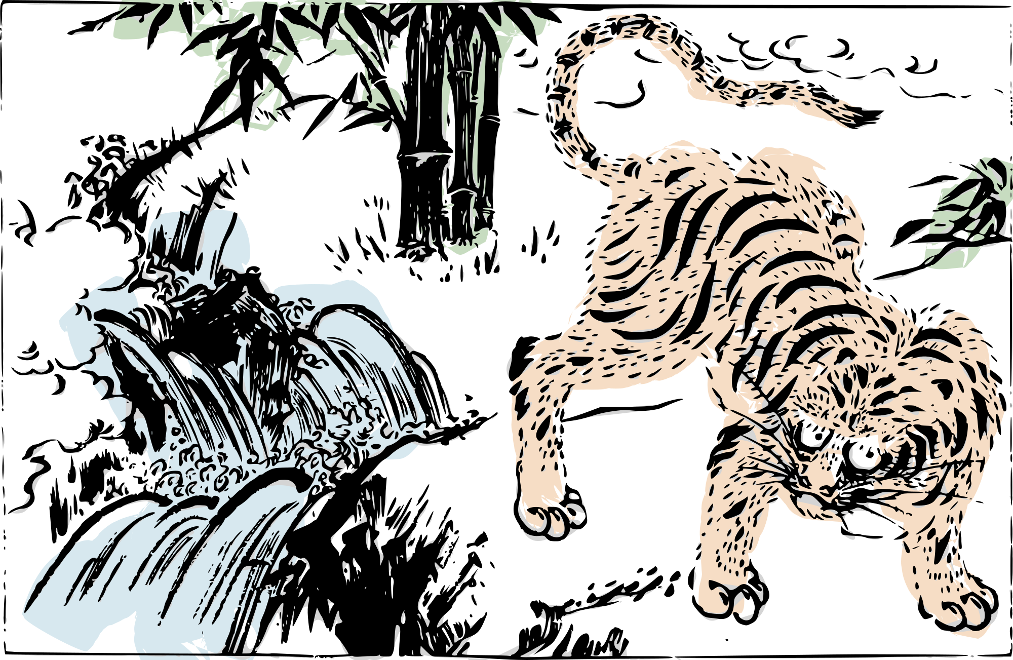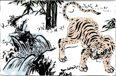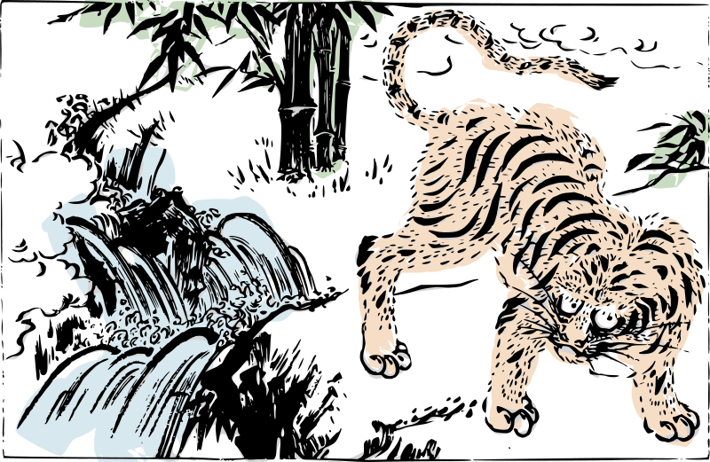 An old depiction of a tiger by a river with a few dashes of colour