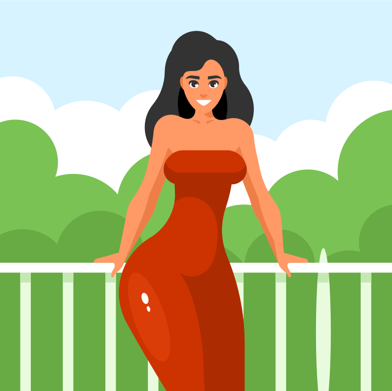 Woman in a red dress, standing on balcony.