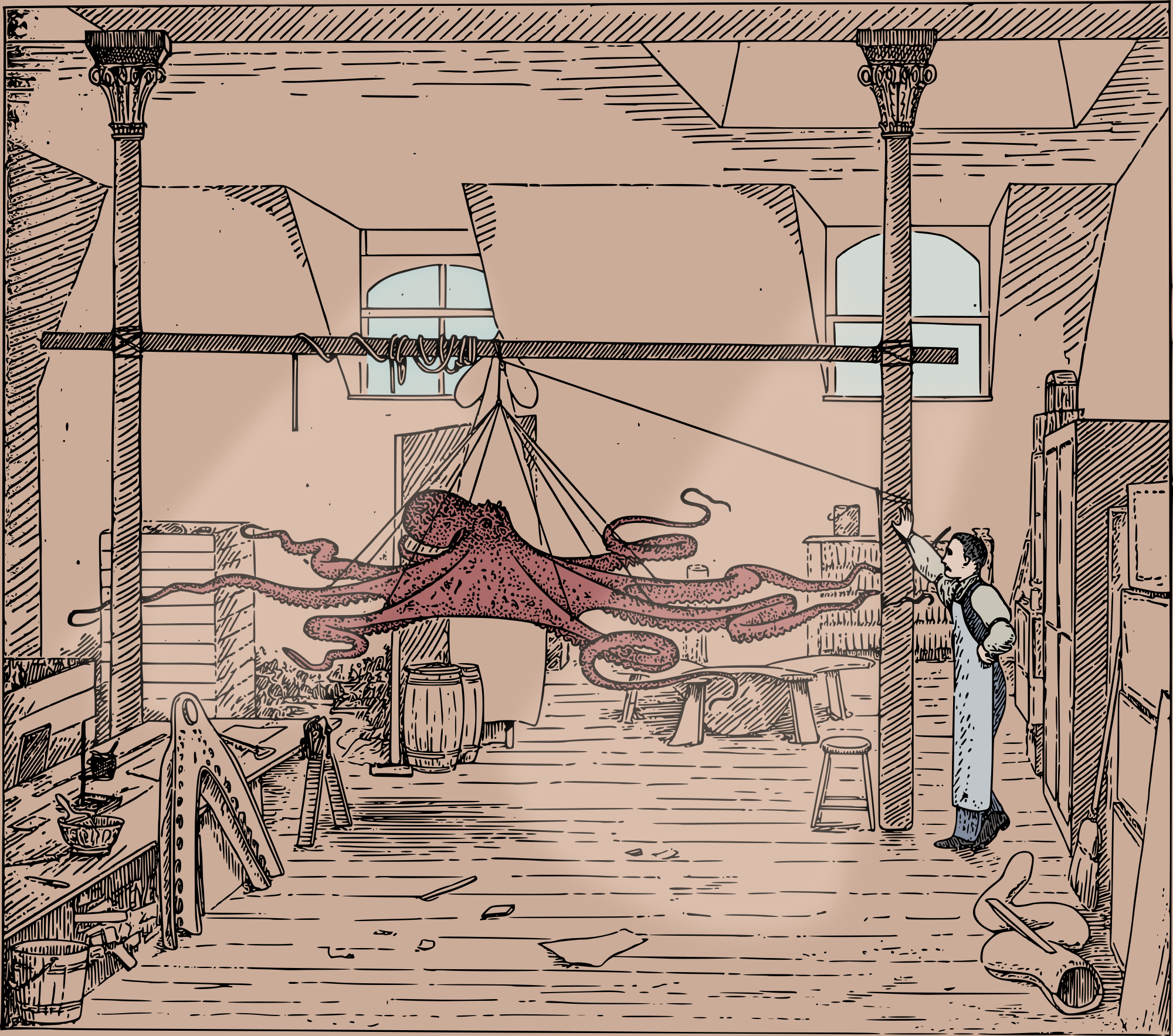 a basic colour version of the man and an octopus in a laboratory