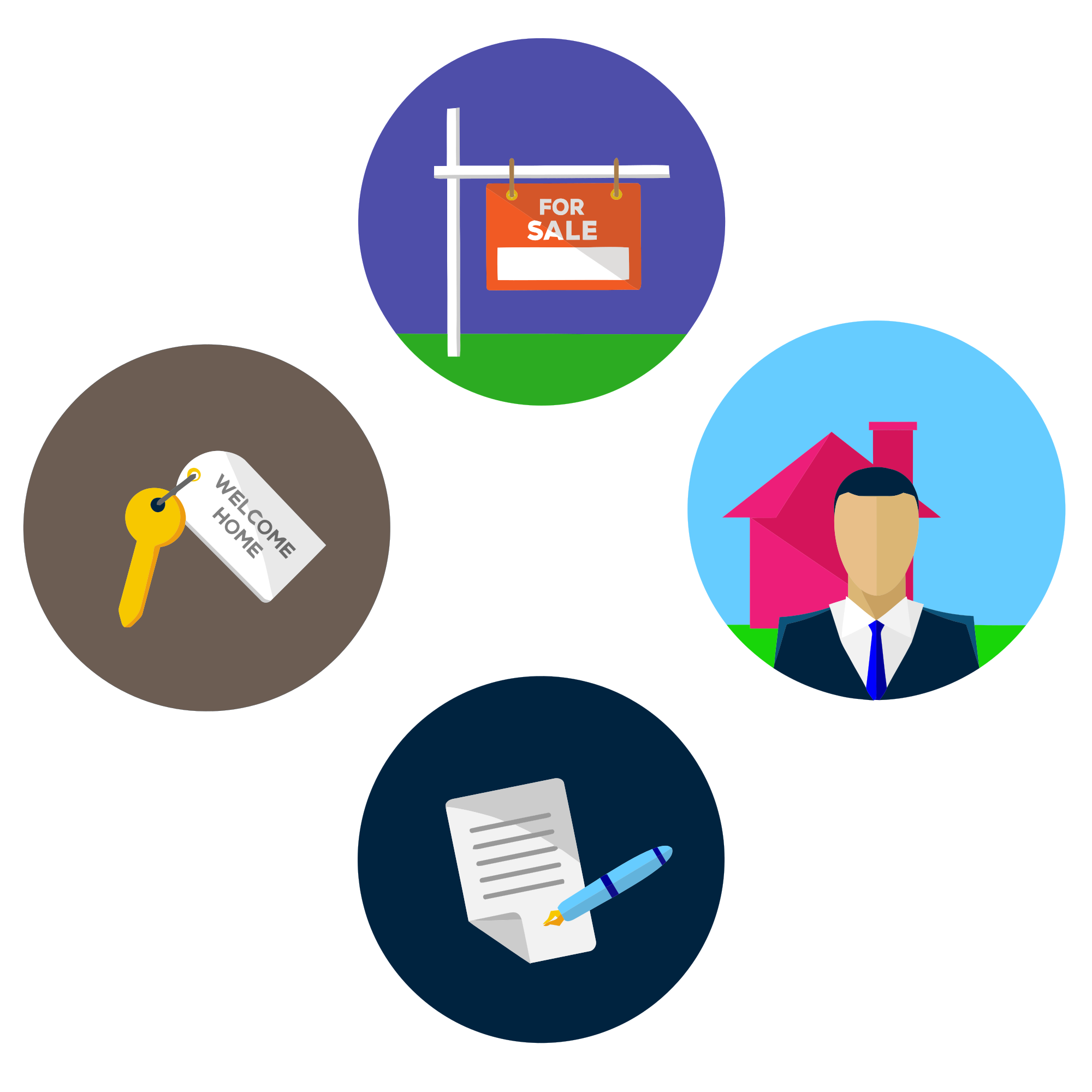 I arranged the icons so that hopefully they tell the story of buying a house in a clockwise spin: seeing a for sale sign, meeting the estate agent, signing a mortgage or purchase agreement, and moving in! good luck!