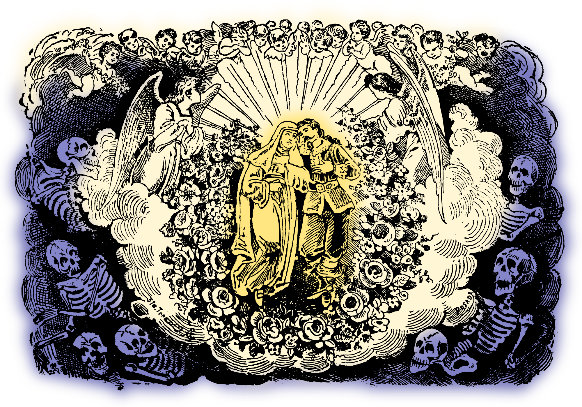 a basic colour remix of this odd heavenly couple surrounded by skeletons and cherubs