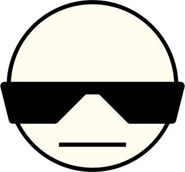 Emoticon-like stylized face with a pale complexion, expressionless mouth, dark sunglasses and downcast gaze.