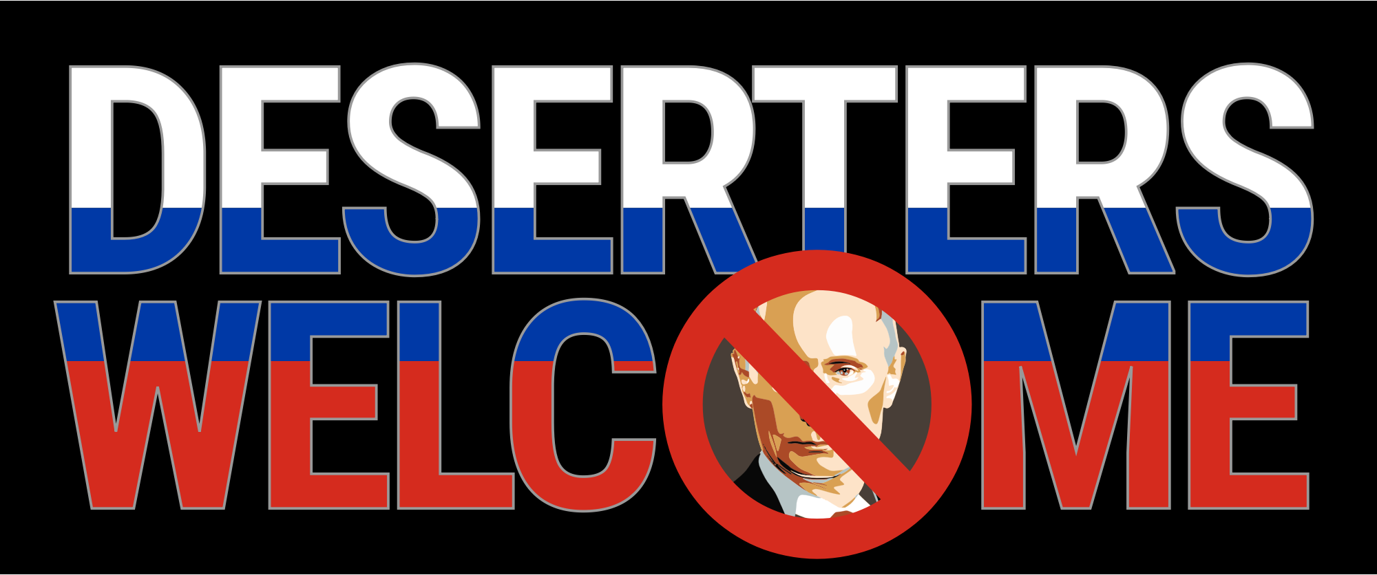 A simple sign saying "DESERTERS WELCOME" where the "O" is a circle with Vladimir Putins face crossed out.