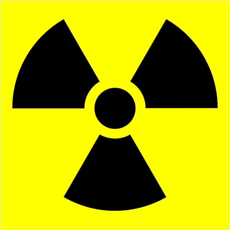 The symbol for radioactive hazard, following the official proportion specifications (radius R for center circle, 1.5R to 5R for blades of trefoil). Done in Inkscape.