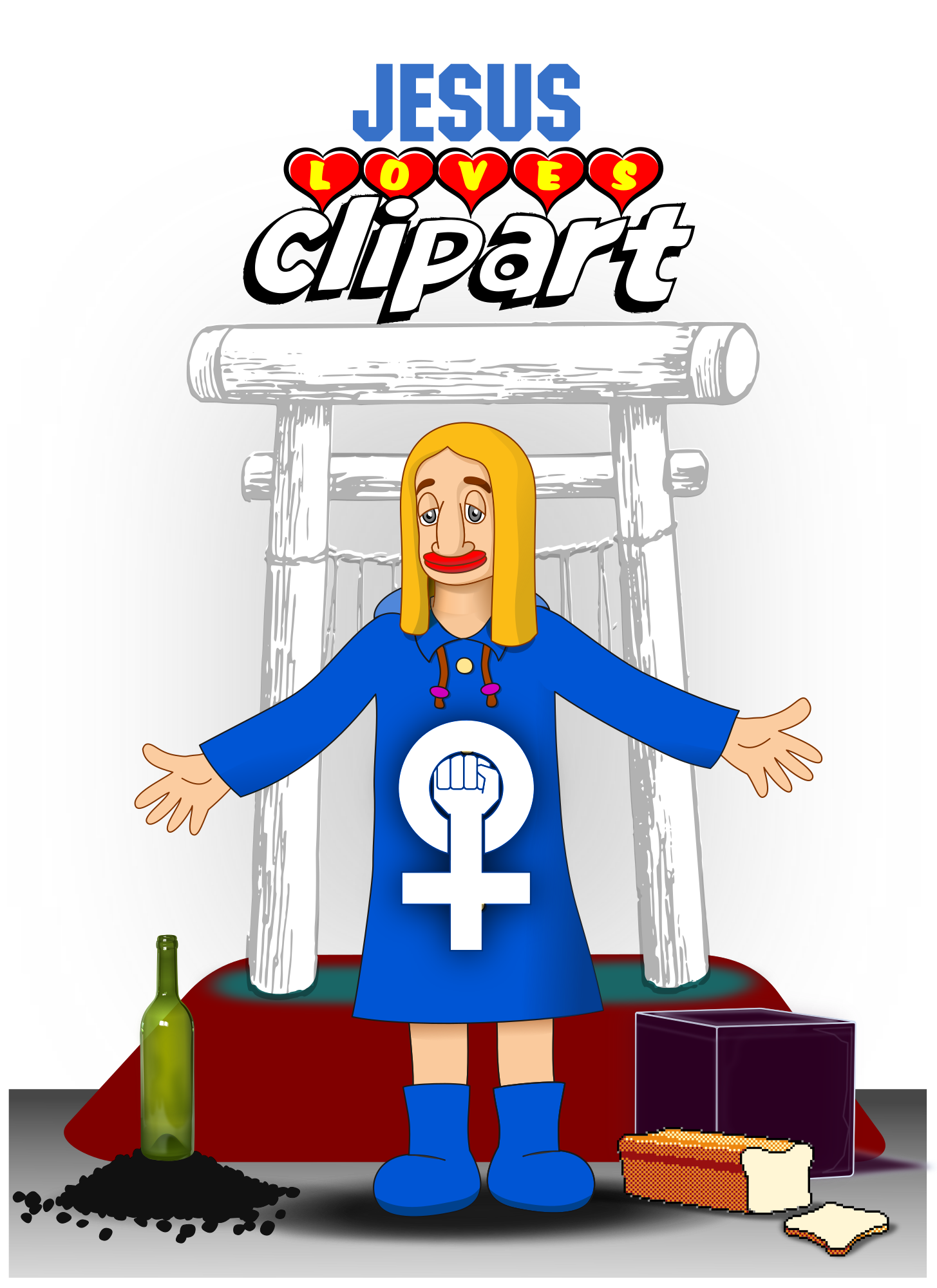 For information, I start from the observation that Jesus loved solidarity and sharing (bread, wine, clothing,...). So, I deduce that if he is still alive, up there, he must appreciate seeing clipart created and exchanged (in the digital public domain). He who liked to speak with images, parables; I think he would like to see these cliparts (messages in pictures) circulated around the world. It's obviously not a certainty, it's a belief and it's also a little for fun that I imagine that.