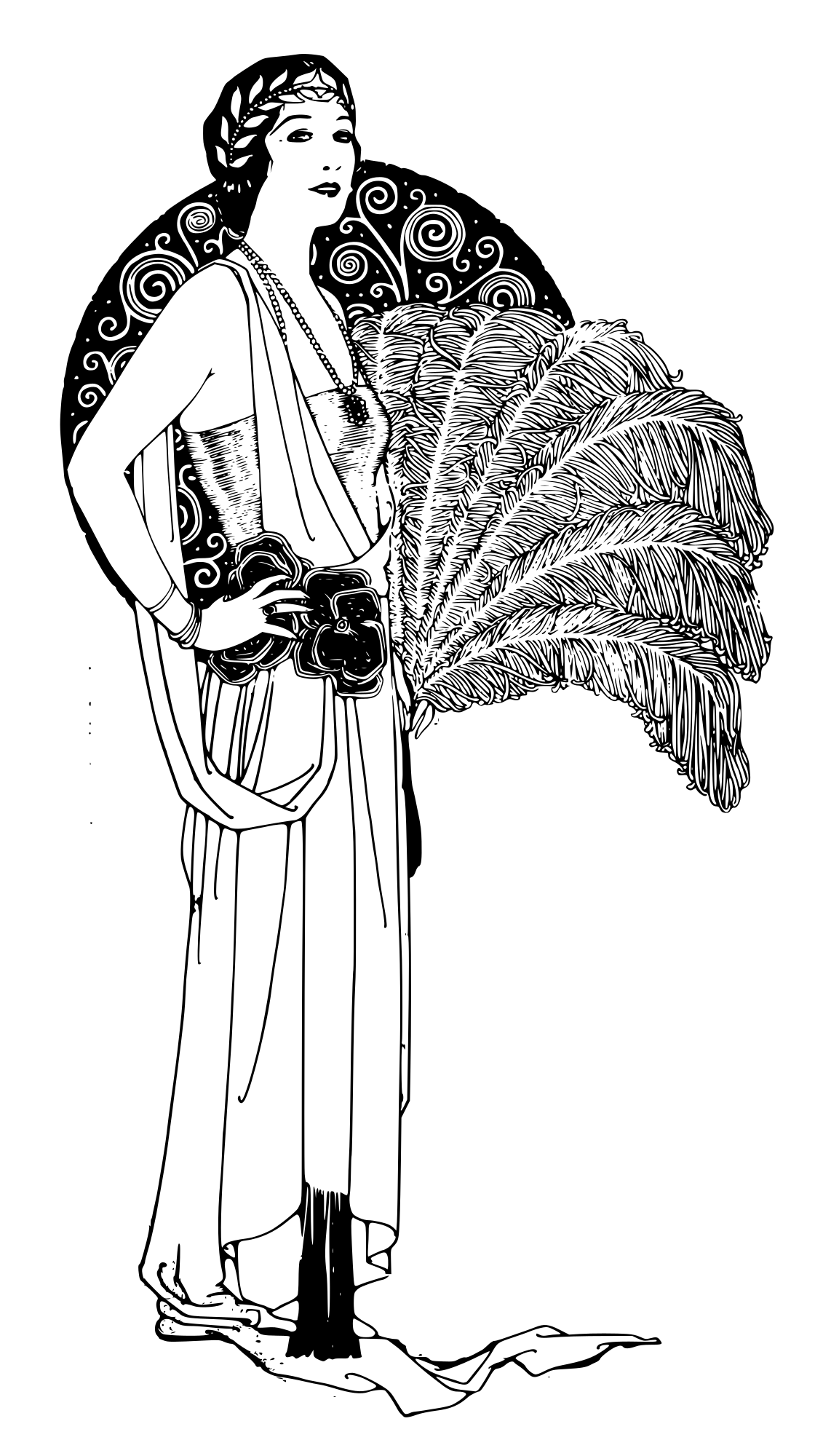 a lady with a big feather fan