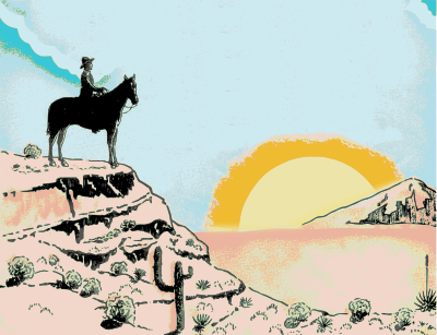 a retro depiction of a cowboy watching a sunset/sunrise in the desert