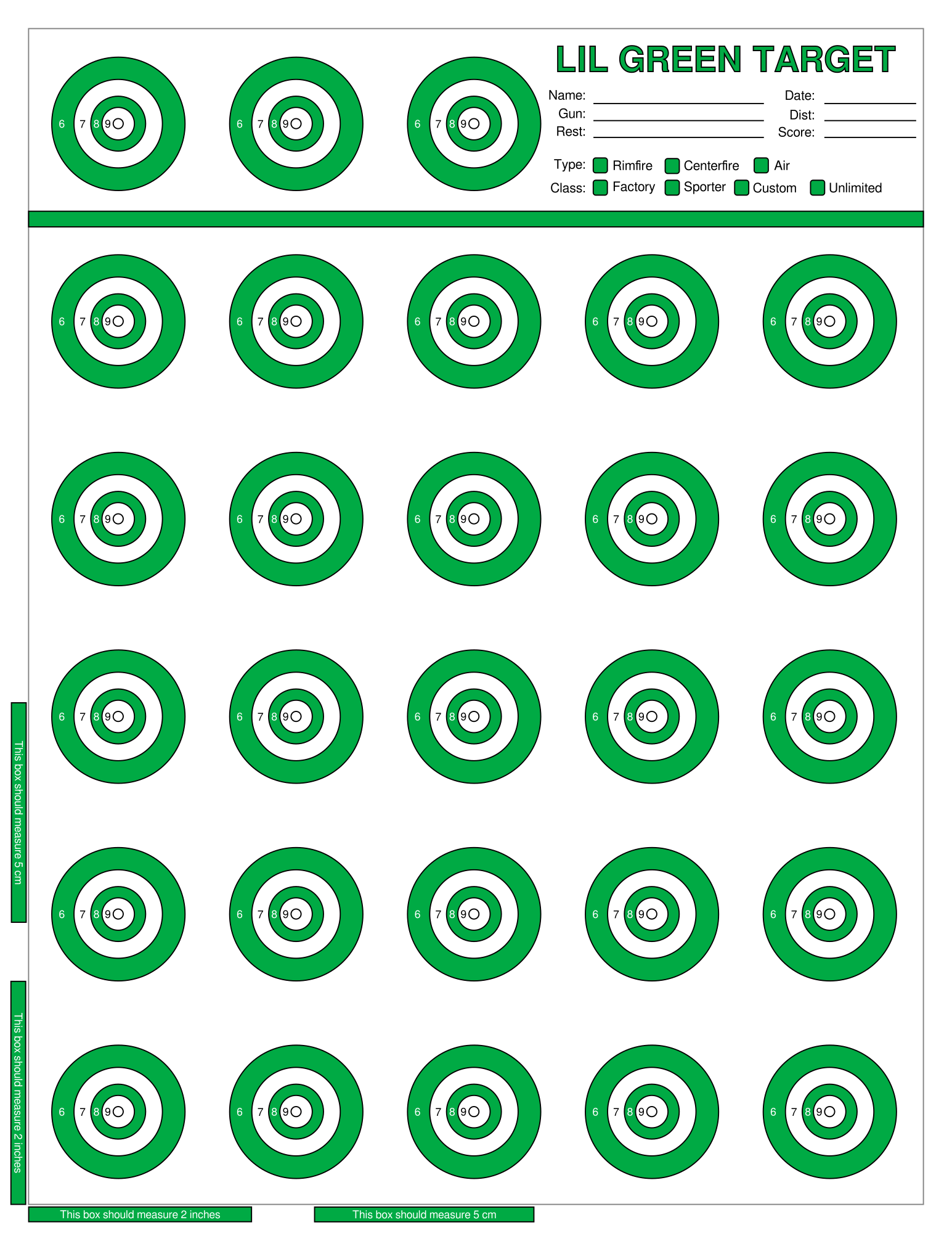 Letter size target which is the same as the big green target with the 4 point and 5 point rings removed. Intended for bench rest shooting at 25 or 50 yards. Created this mostly because folks don't own printers capable of printing the big green target.