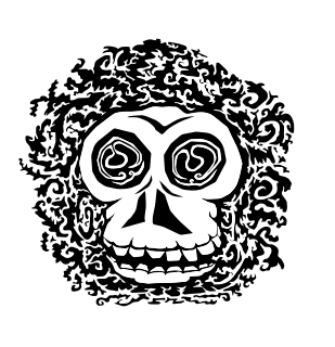 a skull face surrounded by tangly designs - drawn and vectorized digitally