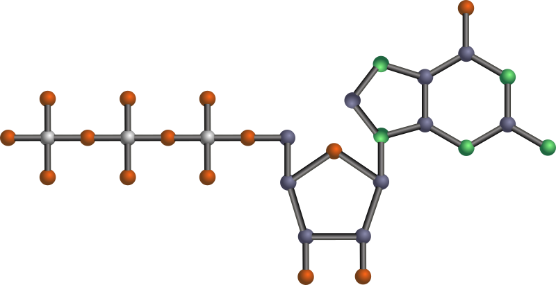 Guanosine 5'-triphosphate, one of the nucleotides (basic units) that make up RNA (ribonucleic acid). Done in Inkscape.